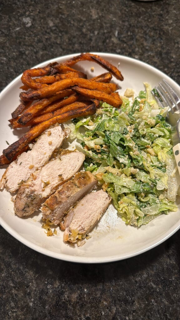 The frozen chicken and fries will typically have air frying instructions on the packages, but I went a bit rogue. I set the air fryer to 400F for 20 minutes to start. I gave the fries a bit of time on their own and then added the chicken about halfway through. Then I simply air fried until the food was crisped to my liking! While the air fryer was air frying away I assembled the salad kit. Super simple!